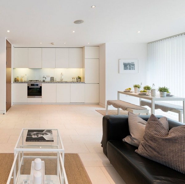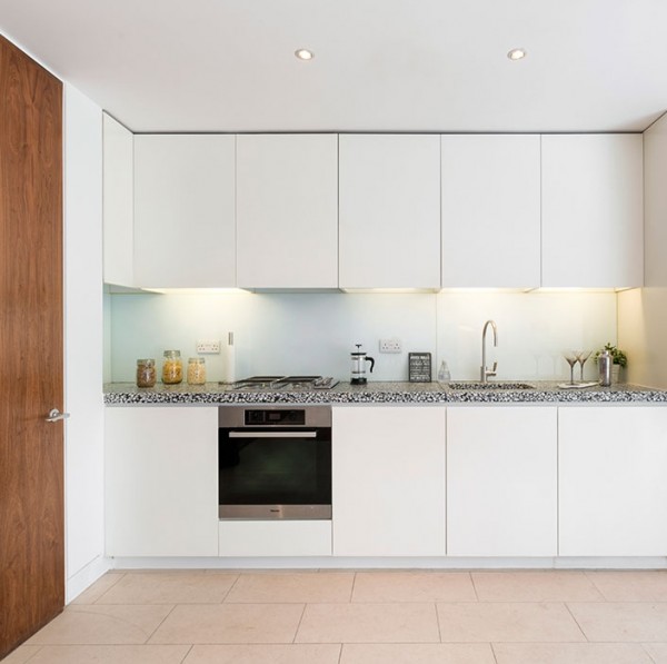 Bathroom floors are in limestone and the walls are set in stylish frosted white glass with backlit mirrors. Bright, practical kitchens are finished with white lacquered units with integrated appliances.